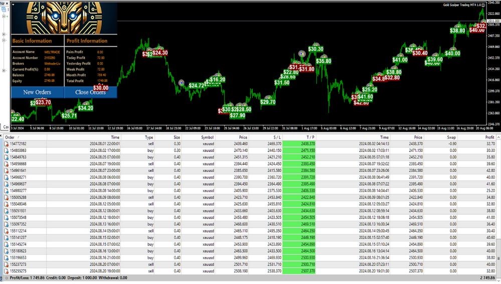 With a one-time fee of $500, the GOLD Scalper EA includes fully optimized set files, risk management settings, and easy MT4 integration. It features advanced filters to avoid high-impact news and unstable market conditions, ensuring a safer scalping experience. Whether you’re new to scalping or a seasoned trader, this EA provides speed, precision, and reliability in gold trading.